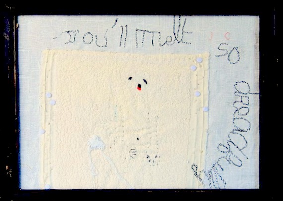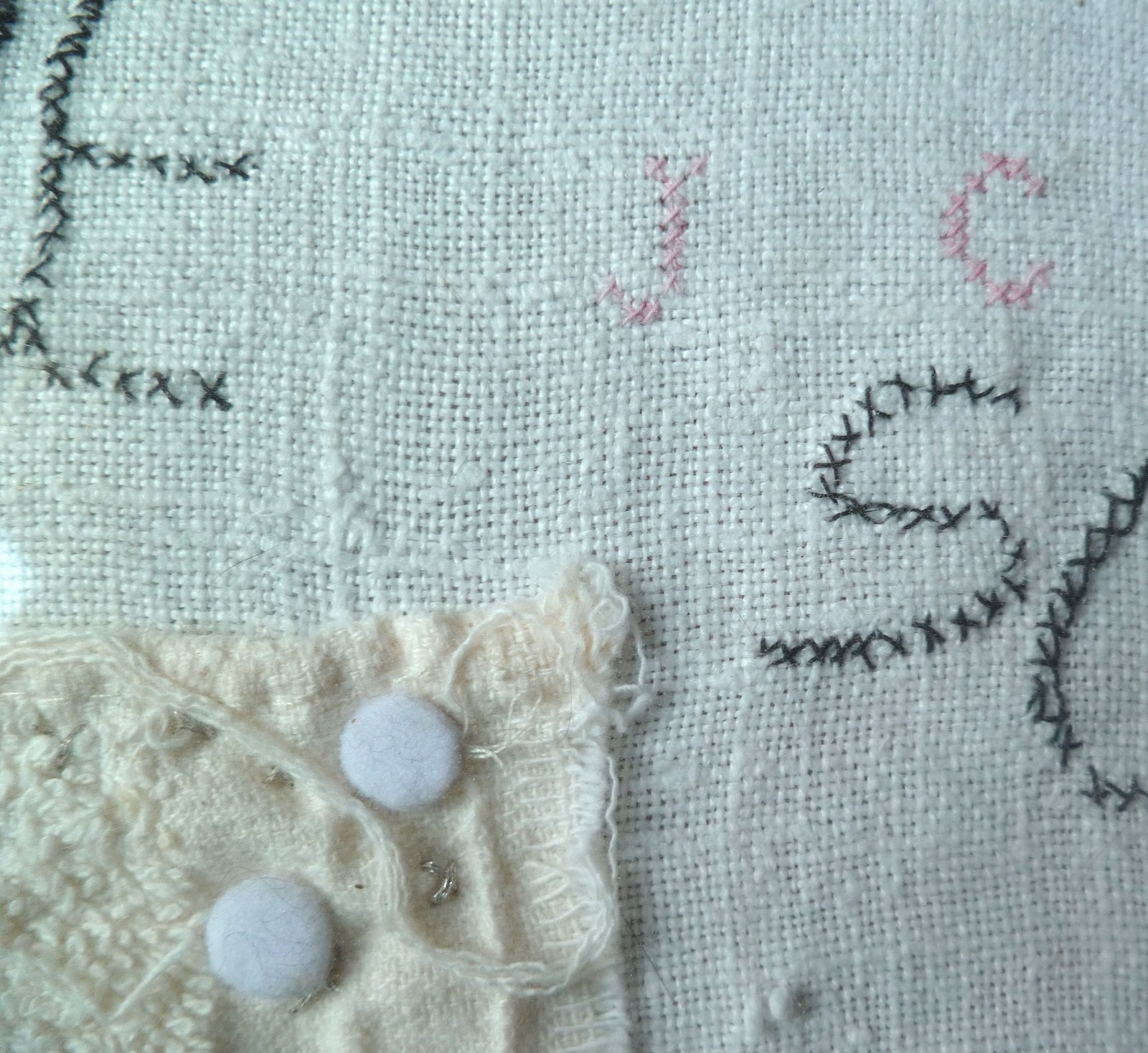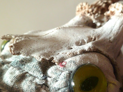 embroidery on old tissue, beads, plastic figurines, ink drawings, stamps...