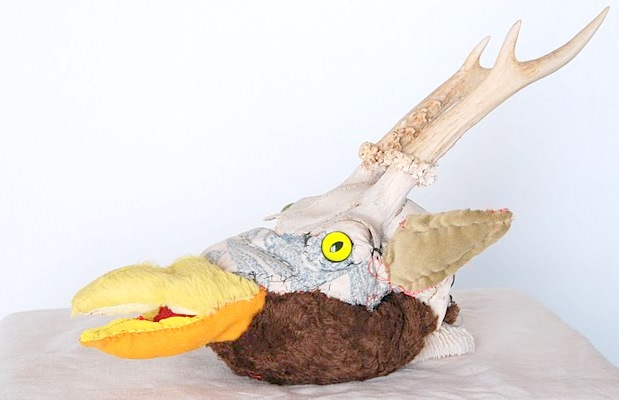 wood, old fabric, beads, plastic figurines, tooth; wool, rocks