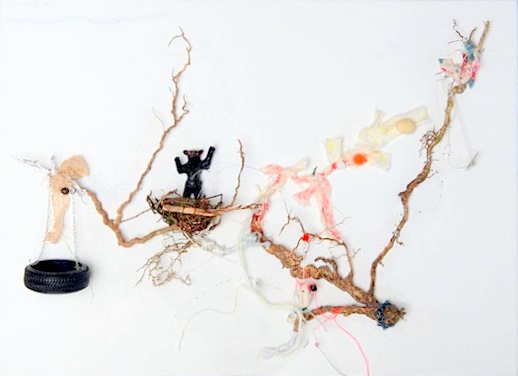 roots, beads, old ribbons, toys, brushwoods.